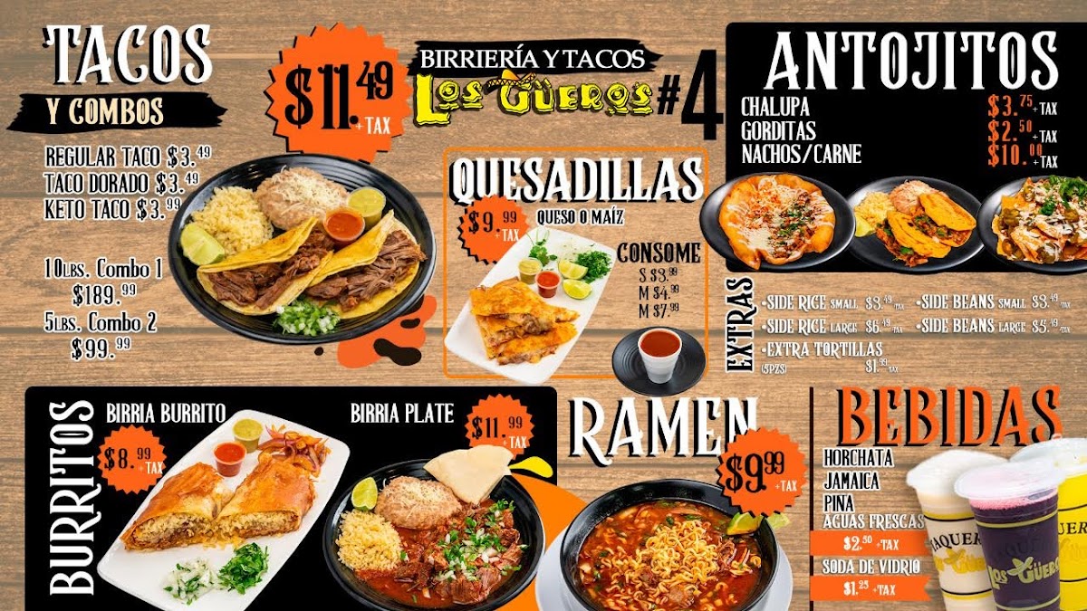 The Birria Menu is a standout, featuring the Regular Birria Taco, Birria Ramen, and the Birria Plate. If you're looking for something crispy and flavorful, try the Birria Taco Dorado or the Quesabirria Combo Plate, both of which are packed with rich, savory birria that melts in your mouth. For taco lovers, the Tacos and Keto Tacos offer fresh, tasty fillings, while those looking for a heartier option can dive into the Burritos. You can choose from options like the Beans and Cheese Burrito, the Burrito Meat Only, or the Breakfast Burrito, as well as the Regular Burrito or the Beans, Rice, and Cheese Burrito.